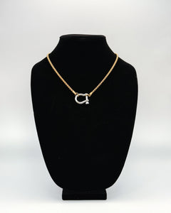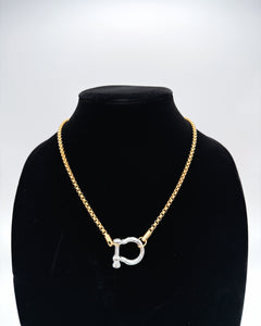 18" gold plated box chain with silver screw horsebit shaped clasp.