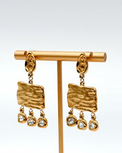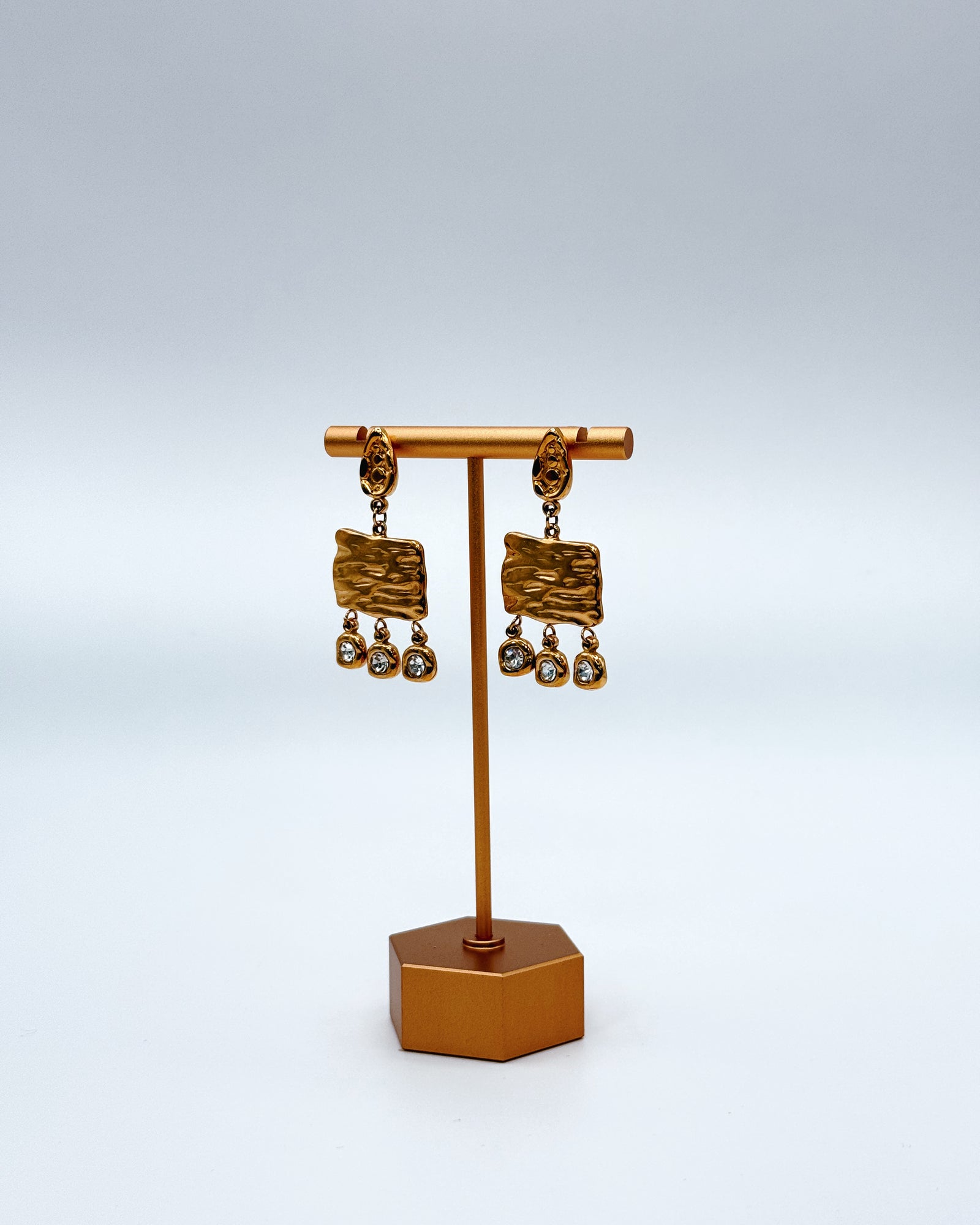 Sculptural and understated, these hammered gold-plated sterling silver earrings blend texture with quiet elegance. The softly irregular surface reflects light in subtle ways, while three delicate cubic zirconia drops bring a refined touch of shimmer. A balance of organic form and modern simplicity — effortless sophistication for everyday or evening wear.
