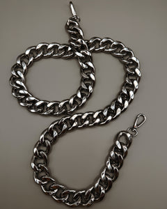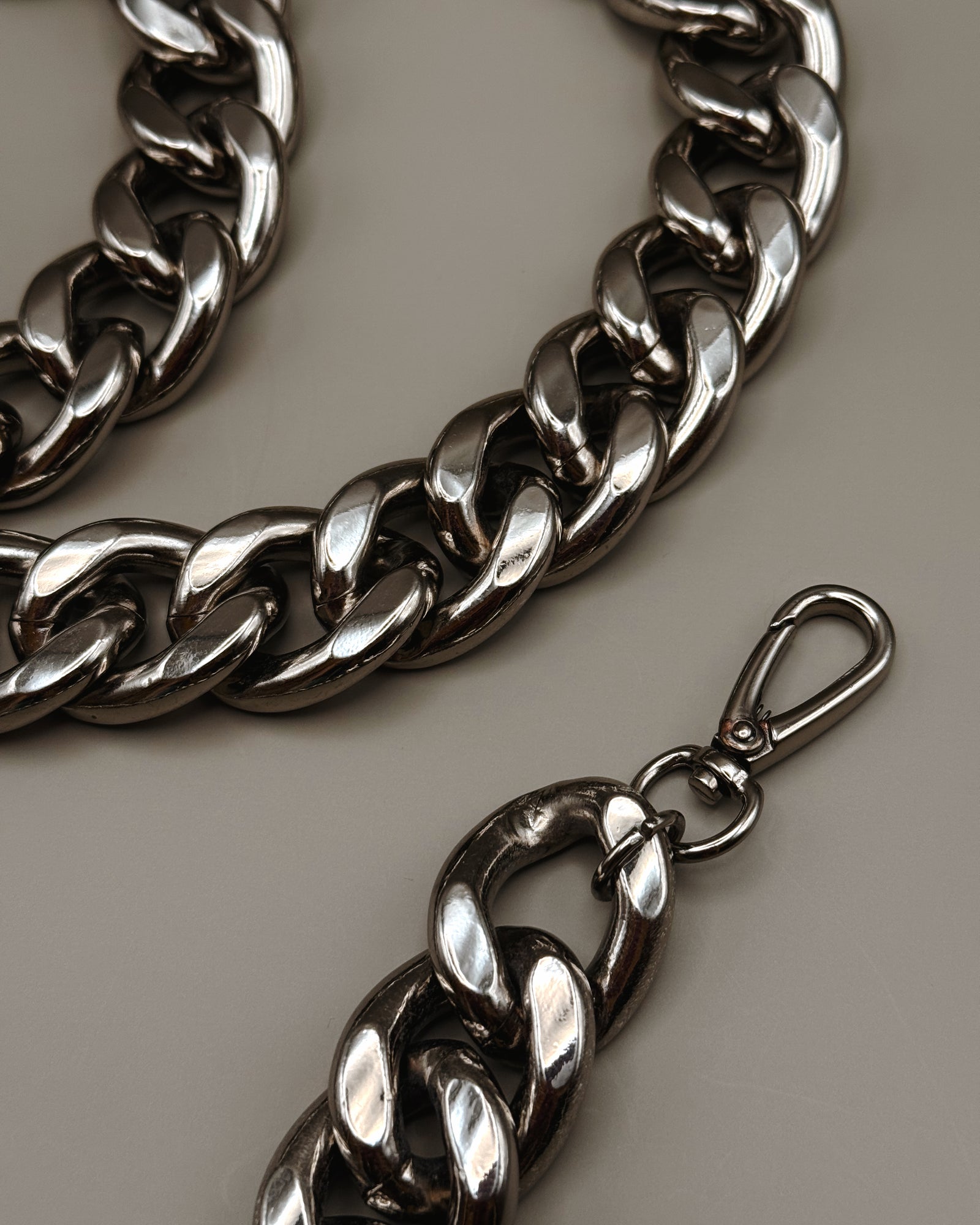 Transform any bag into a bold fashion statement with this oversized chain crossbody strap. Crafted in gleaming silver, the chunky links create an undeniable presence that elevates everyday accessories into luxury pieces. At 48 inches long, it drapes beautifully across the body, offering versatile styling options for totes, clutches, or structured handbags.