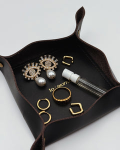 A soft-sided leather tray that keeps your everyday essentials gathered with ease and style. Lightweight, elegant, and quietly luxurious — perfect for jewelry, pocket treasures, lip balm, or bedside necessities.